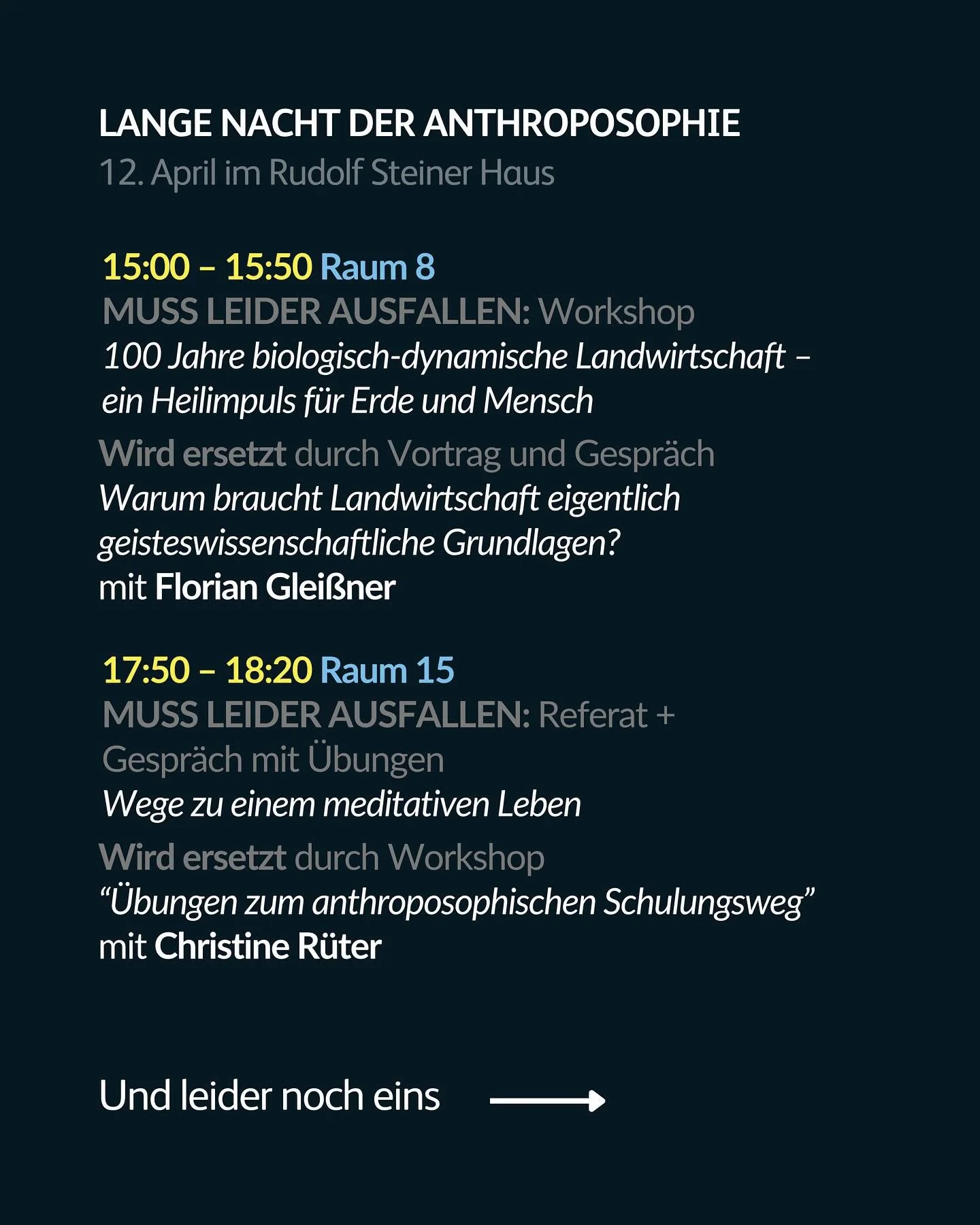 Bei der Langen Nacht stellen Experten aus Anthroposophie, Gesundheit, Kunst, Religion, Lernen, Landwirtschaft, Ökonomie und Gesellschaft in Workshops, Gesprächen und Vorträgen ihre Erfahrungen und weiterführende Gedanken vor, die Sie aufgreifen, mit anderen Ideen verweben oder im Dialog mit eigenen Vorstellungen weiterentwickeln können. Als Anregung ist die reiche Vielfalt und Dichte der Angebote gedacht. Weiterführende Erkundungen können Sie an den Infoständen individuell verabreden.